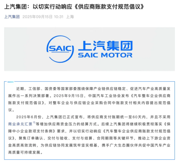 倡议发布后,中国第一汽车集团有限公司、上海汽车集团股份有限公司、赛力斯集团股份有限公司、比亚迪汽车工业有限公司17家重点整车企业,均作出供应商货款“支付账期不超过60天”的承诺,明确表示落实账期。