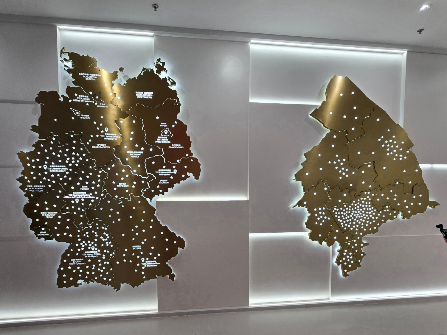 太仓中德合作展示中心,有对德合作的全景展示。步入展厅,迎面就是德国和太仓的地图,上面的星形图案密密麻麻。工作人员介绍,德国地图上的星星,标示了在太仓的德企来自哪里。右边的太仓地图上,星星显示德企的落户情况。