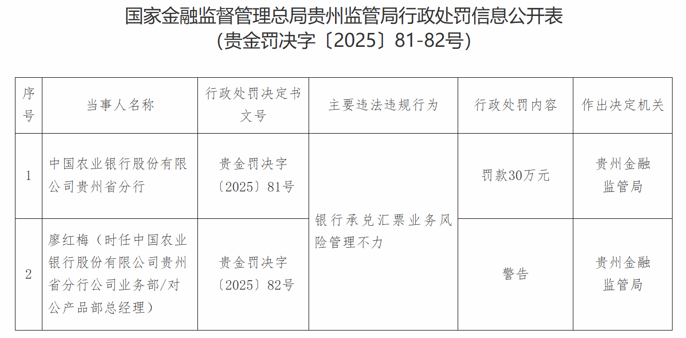 因银行承兑汇票业务风险管理不力,农业银行贵州省分行被罚款30万元,时任该行公司业务部/对公产品部总经理廖红梅被警告。