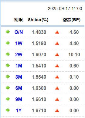 14天期上行10.1个基点,报1.607%,与1月期品种(1.541%)、3月期品种(1.554%)形成倒挂。