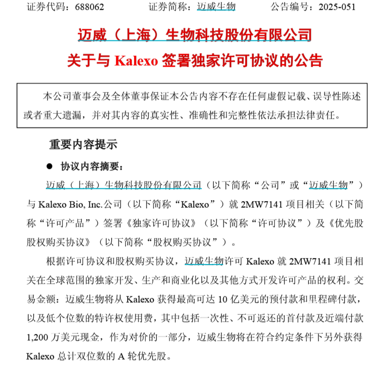 根据许可协议,迈威生物许可Kalexo在全球范围独家开发、生产和商业化以及其他方式开发许可产品的权利。交易金额方面,迈威生物将从Kalexo获得最高可达10亿美元的预付款,以及低个位数的特许权使用费,其中包括一次性、不可返还的首付款及近端付款1200万美元现金。