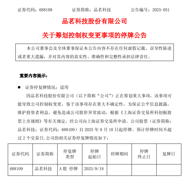【大河财立方消息】9月17日,品茗科技公告称,因正在筹划重大事项,该事项可能导致公司控制权变更,公司股票自2025年9月18日起停牌,预计停牌时间不超过2个交易日。