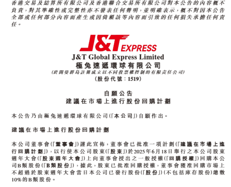 极兔速递公告中提到,董事会认为B类股份的交易价格低估了集团的业绩及内在价值。董事会认为,建议在市场上进行回购计划将为股东创造资本管理效益,且符合公司及股东的整体利益。
