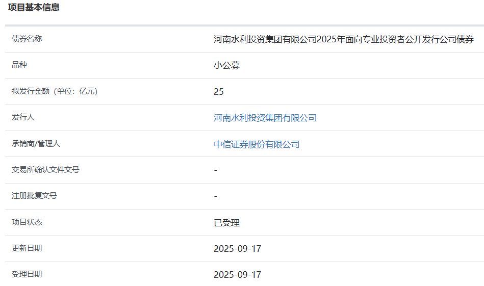【大河财立方消息】9月17日,河南水利投资集团有限公司2025年面向专业投资者公开发行公司债券项目,获上交所受理。