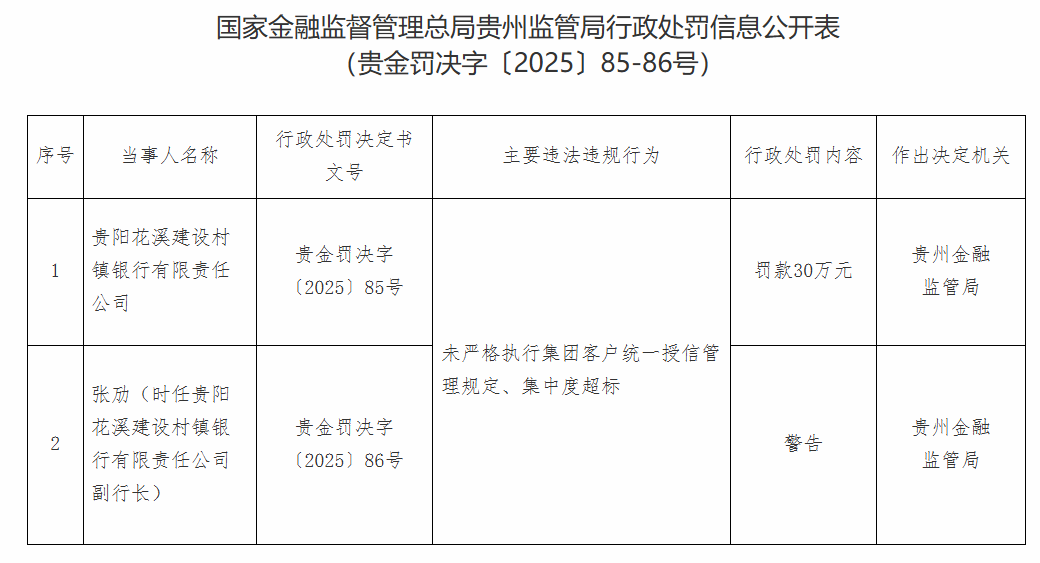 因未严格执行集团客户统一授信管理规定、集中度超标,贵阳花溪建设村镇银行被罚款30万元,时任该行副行长张劢被警告。