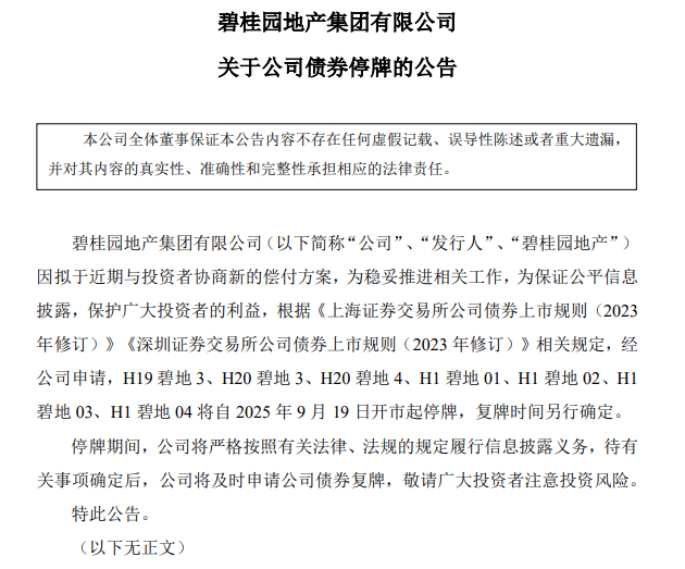 【大河财立方消息】9月18日,碧桂园地产集团有限公司发布公告称,因拟于近期与投资者协商新的偿付方案,为稳妥推进相关工作,保证信披公平和保护投资者利益,经申请,H19碧地3、H20碧地3、H20碧地4、H1碧地01、H1碧地02、H1碧地03、H1碧地04等7只公司债券将自2025年9月19日开市起停牌,复牌时间另行确定。