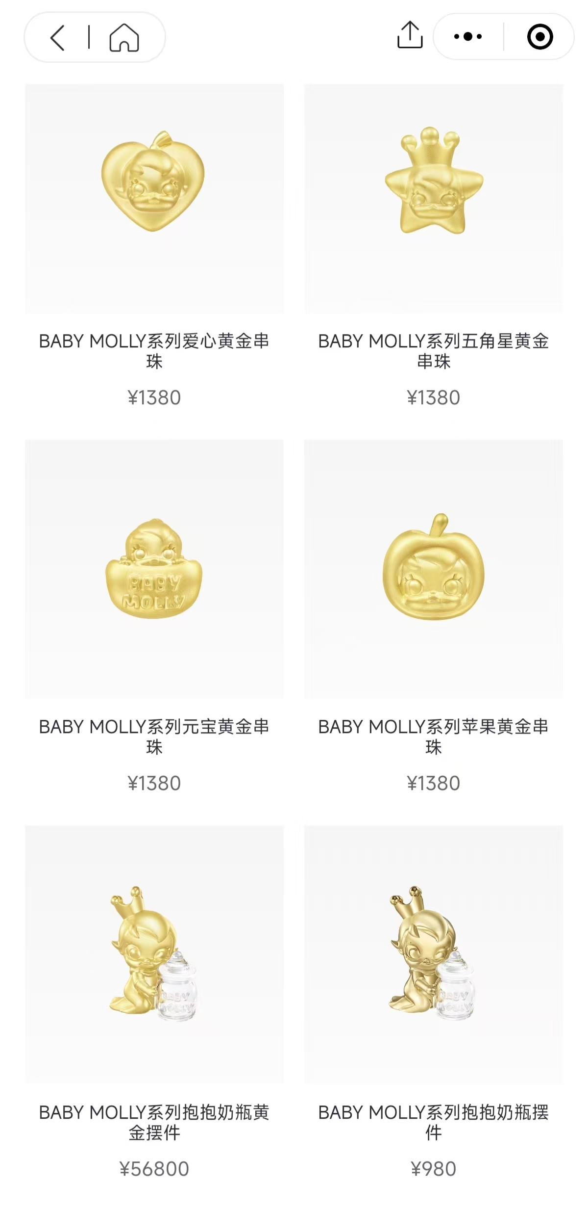 记者通过POPOP小程序看到,BABY MOLLY系列金饰产品价格区间为980元至56800元。其中,价格最贵的是重量约为41克的BABY MOLLY抱抱奶瓶黄金摆件,售价56800元。