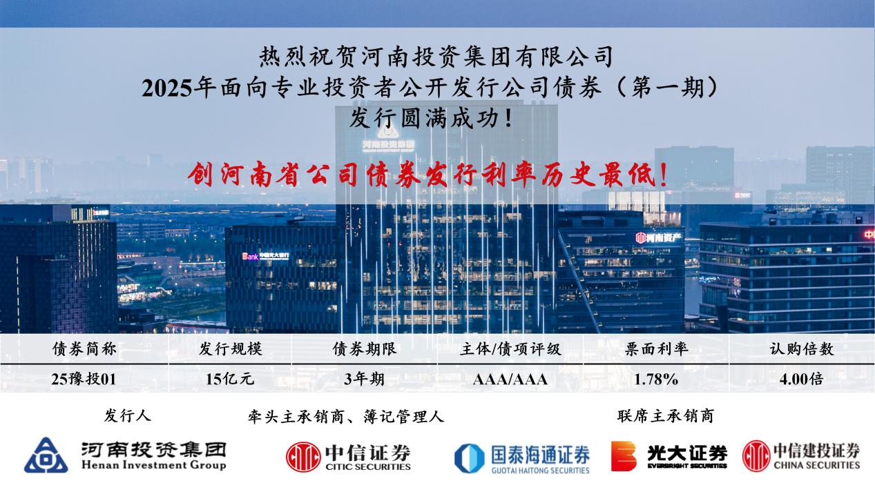 【大河财立方 记者 杨萨】9月18日,河南投资集团有限公司(以下简称河南投资集团)发行2025年第1期公司债券,发行规模15亿元,期限3年,票面利率1.78%,获4倍认购。本期债券创河南省有史以来公司债最低发行利率。