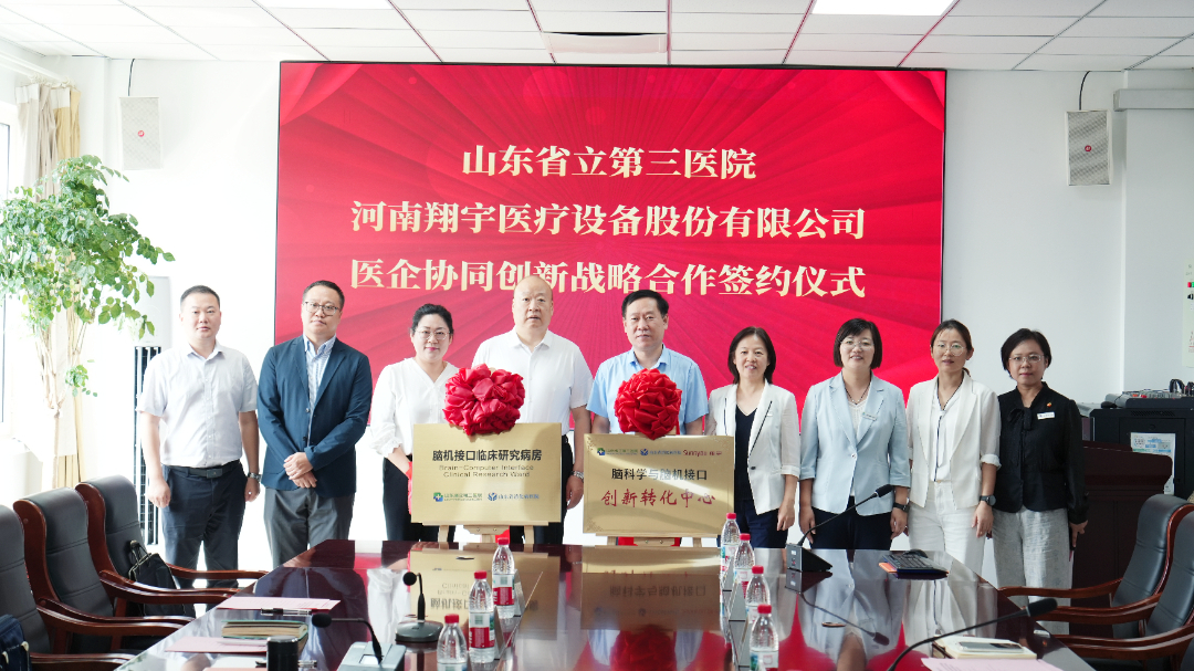2025年9月18日上午,翔宇医疗与山东省立第三医院举行医企协同创新战略合作签约仪式暨脑科学与脑机接口创新转化中心揭牌仪式。山东省立第三医院党委副书记、院长冯肖亚,山东省立第三医院党委委员、副院长刘敏,山东省立第三医院党委委员、副院长胡浩然,山东省立第三医院康复护理院副院长陈莉,翔宇医疗董事长何永正等出席仪式。