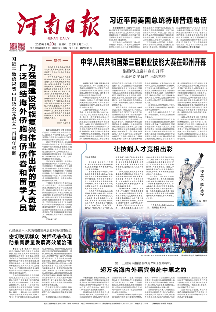 技耀中原,能动未来。9月19日晚,由人力资源社会保障部主办、河南省人民政府承办的中华人民共和国第三届职业技能大赛在郑州市开幕。国务委员谌贻琴出席开幕式并宣布开幕。