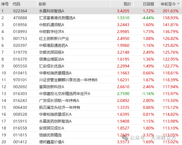 在重仓个股持续向好的基础上,这些绩优基金的业绩颇为亮眼。其中今年的“冠军基”永赢科技智选年初至今回报达到201.63%,中航机遇领航、德邦鑫星价值两只发行较早的基金,近两年收益更是双双超过220%。