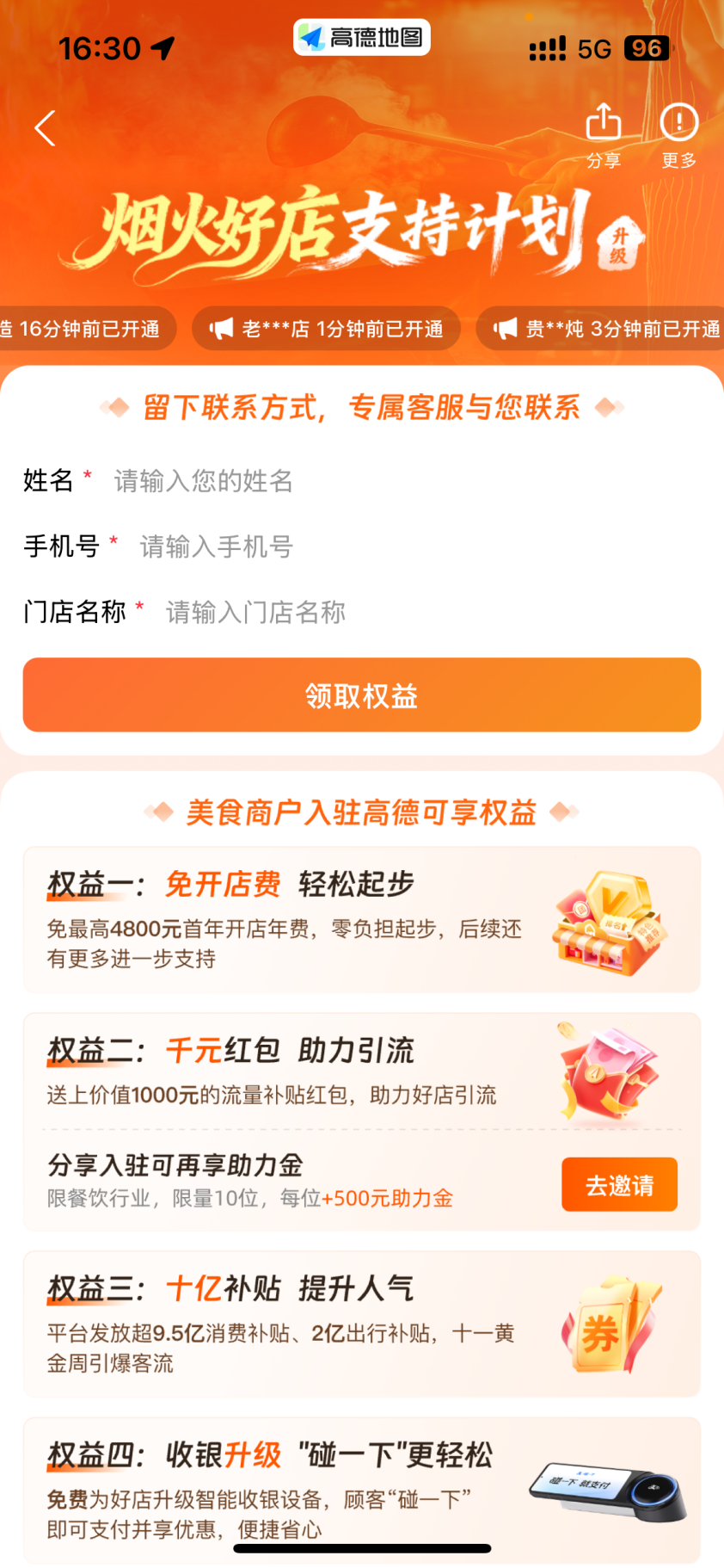 如今,为餐企入驻提供免年费通道,再次释放对到店业务的想象力。在开店成本上,商家可免最高4800元首年开店年费,实现零负担起步。对于引流难题,高德送上价值1000元的流量补贴红包,助力好店快速获得曝光;餐饮行业商家分享入驻还可再享助力金,限量10位,每位额外获得500元助力金,进一步降低获客成本。为了在十一黄金周引爆客流,高德投入超9.5亿元消费补贴、2亿元出行补贴,通过十亿级补贴矩阵提升商家人气。