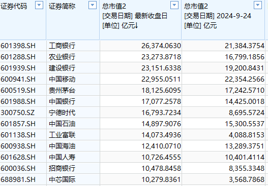 去年9月24日收盘,A股市值超万亿的上市公司为9家,按照排名分别为中国移动、工商银行、建设银行、贵州茅台、农业银行、中国石油、中国银行、中国海油、中国人寿。