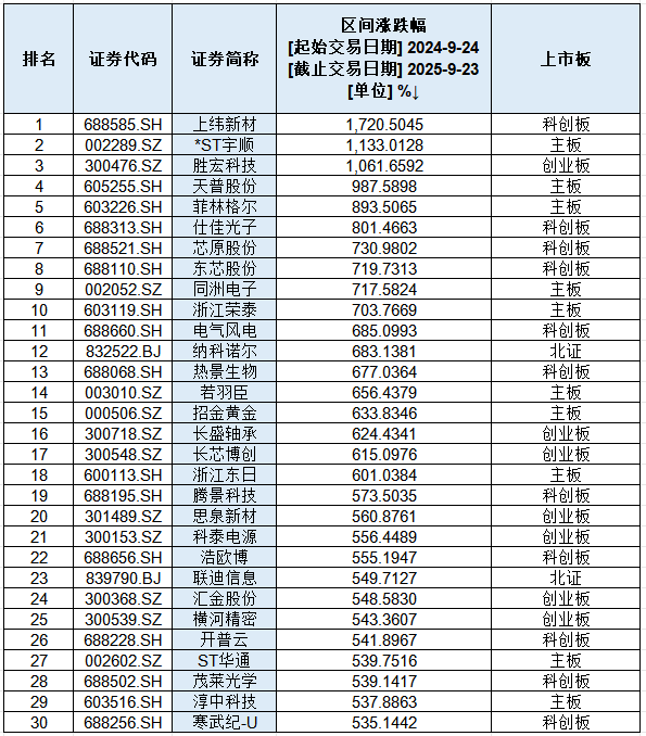 有三只牛股区间涨幅超1000%,领跑本轮行情,分别为上纬新材、*ST宇顺以及胜宏科技,涨幅分别高达1720.50%、1133.01%、1061.66%。