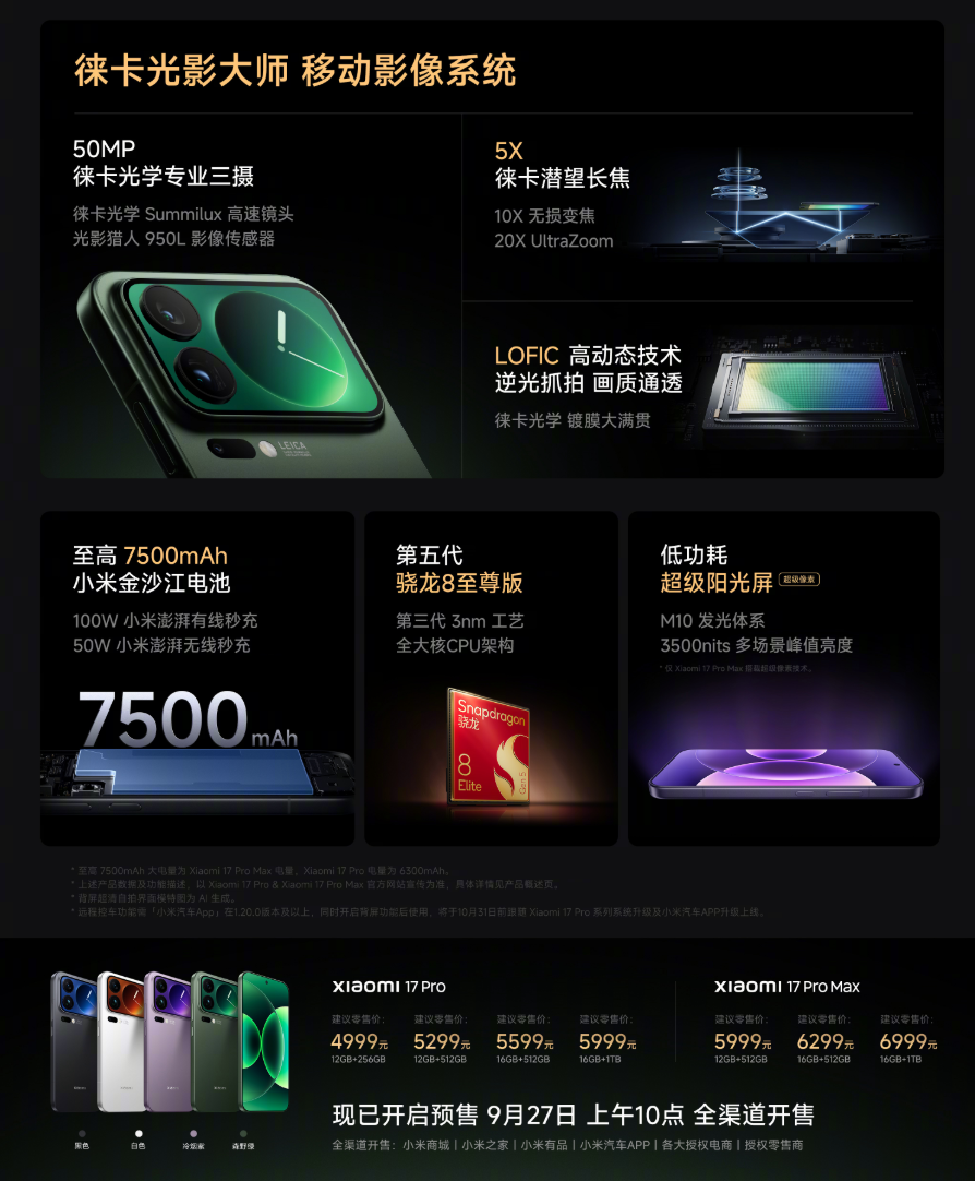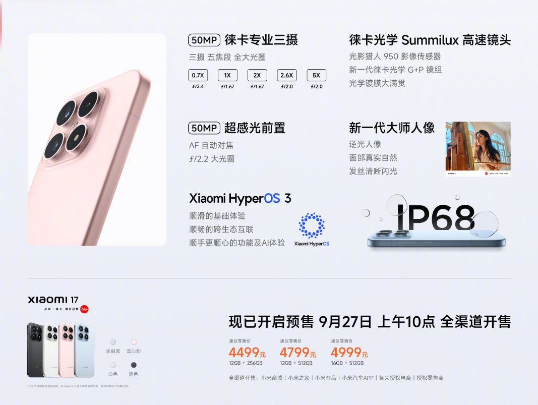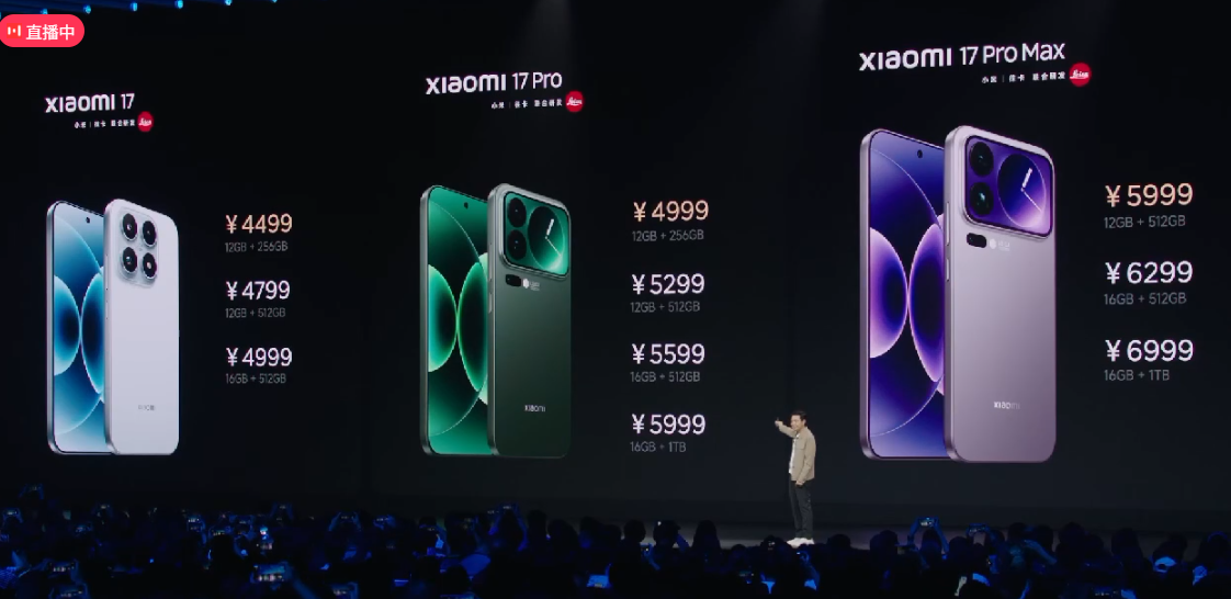 【大河财立方消息】9月25日晚间,小米17手机全系列发布。小米17定价4499元起,小米17 Pro定价4999元起,小米17 Pro Max定价5999元起。现已开启预售,9月27日早10点,正式开售。