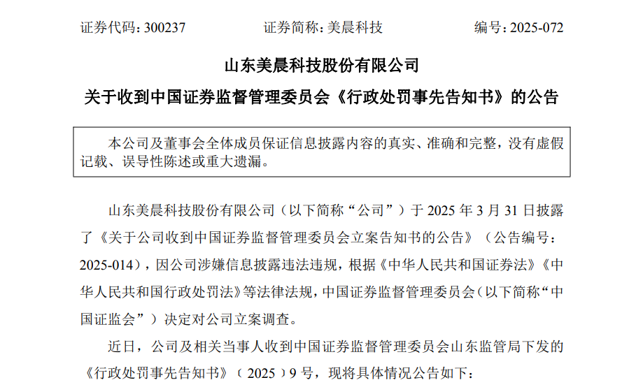 【大河财立方消息】9月26日晚间,山东美晨科技股份有限公司(证券简称:美晨科技)公告,收到山东证监局下发的《行政处罚事先告知书》。