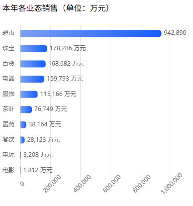 在2025年各个业态中,超市销售额“断层领跑”,为94.2亿元,第二名珠宝类销售额17.8亿元,第三名百货类16.8亿元,随后是电器类销售额15.9亿元。在15家门店里,仅胖东来时代广场店销售额就有43.8亿元。
