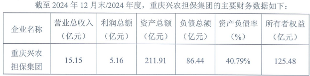 被吸收合并方重庆兴农担保集团成立于2011年,注册资本金超100亿元。截至公告披露日,重庆兴农担保集团的控股股东为重庆渝富控股集团有限公司,实际控制人为重庆市国资委。财务数据显示,重庆兴农担保集团2024年实现营业总收入15.15亿元,利润总额5.16亿元。截至2024年末,重庆兴农担保集团资产总额为211.91亿元。