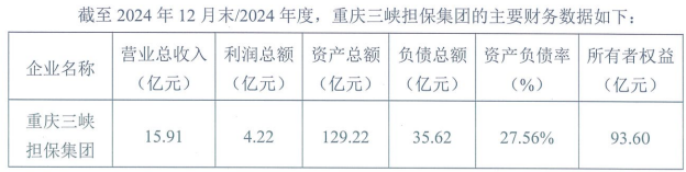 财务数据显示,重庆三峡担保集团2024年实现营业总收入15.91亿元,利润总额4.22亿元。截至2024年末,重庆三峡担保集团资产总额为129.22亿元。2024年年末在保余额889.78亿元。