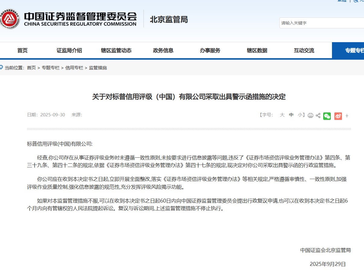 【大河财立方消息】9月30日,北京证监局发布关于对标普信用评级(中国)有限公司采取出具警示函措施的决定。