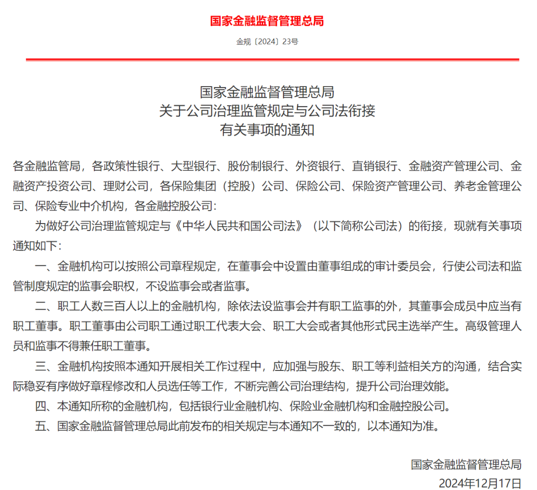 一方面,监事会依法撤销后,将由董事会审计委员会行使《中华人民共和国公司法》(以下简称“公司法”)和监管制度规定的监事会职权,持续强化内部监督制衡。新修订的公司法已于2024年7月1日起施行,对监事会、职工董事设置等方面提出了新要求。为了贯彻落实公司法、做好监管制度衔接,国家金融监督管理总局2024年12月印发《关于公司治理监管规定与公司法衔接有关事项的通知》,允许金融机构根据自身实际,优化监督机构设置,可以继续保留监事会、监事,也可以选择由董事会下设的审计委员会履行监事会职责,不设监事会或监事。
