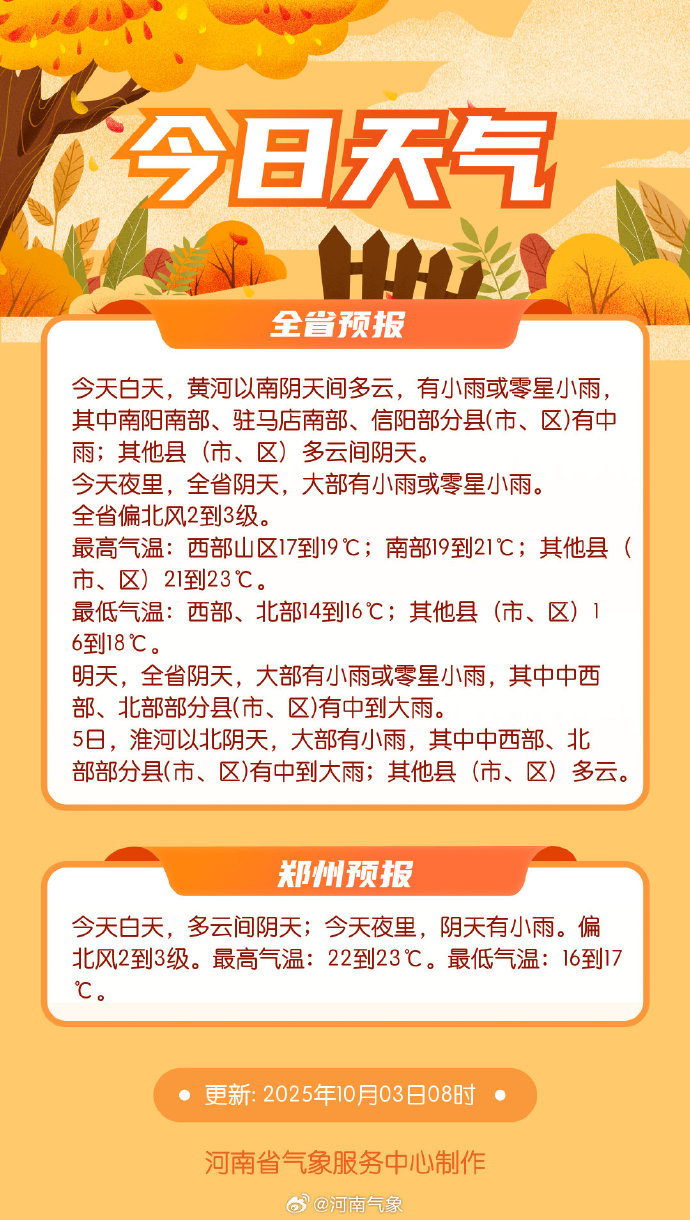 【大河财立方消息】河南气象台2025年10月3日8时更新气象信息,今天白天,黄河以南阴天间多云,有小雨或零星小雨,其中南阳南部、驻马店南部、信阳部分县(市、区)有中雨;其他县(市、区)多云间阴天。今天夜里,全省阴天,大部有小雨或零星小雨。全省偏北风2到3级。最高气温:西部山区17到19℃;南部19到21℃;其他(县市、区)21到23℃。