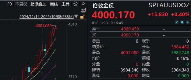 【大河财立方消息】10月8日,现货黄金突破4000美元/盎司大关,续创新高。