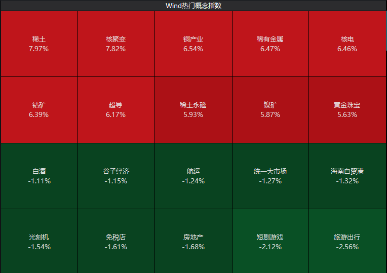 Wind数据显示,板块题材方面,稀土板块领涨,涨幅接近8%,核聚变板块涨7.82%,铜产业、稀有金属、核电、钴矿、超导等板块涨超6%。旅游出行、短剧游戏、房地产、免税店、光刻机等板块跌幅居前。