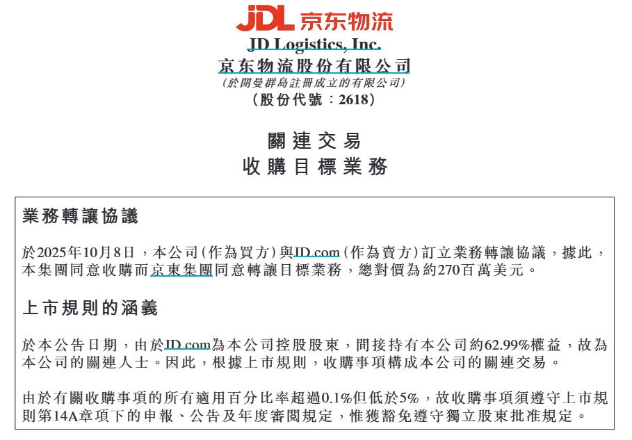 【大河财立方 记者 丁洋涛】10月9日,京东物流(02618.HK)发布公告,宣布已于10月8日与京东集团(JD.com)签署正式协议,将以约2.7亿美元的对价,全面收购京东集团旗下的本地即时配送服务子公司——达疆及达盛的100%股权,即原达达集团的本地即时配送业务,收购事项预计于2025年第四季度完成。这标志着京东物流正式将核心的即时配送网络全面纳入麾下,为其供应链解决方案补上关键一环。