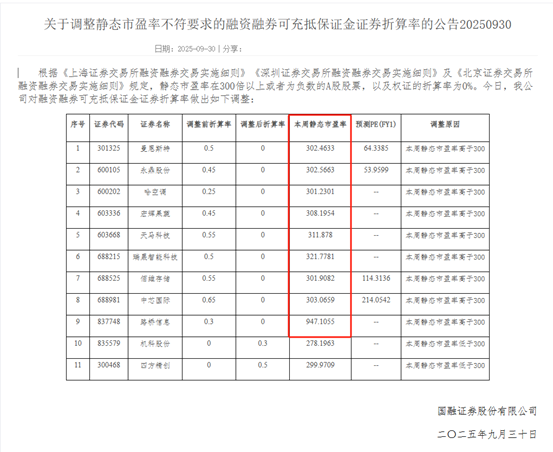 记者注意到,除了东方财富证券,东方证券和国融证券也在9月30日官网发布了类似的公告,因静态市盈率异常,将中芯国际、佰维存储、天马科技、瑞晟智能科技、曼恩斯特、宏辉果蔬、永鼎股份、路桥信息、哈空调的折算率均调整为0,上述调整自10月9日正式生效。