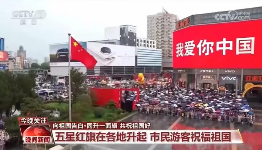 “起来!不愿做奴隶的人们……”随着国歌缓缓响起,冉冉升起的五星红旗在细雨中显得格外鲜艳。众人目光都聚焦在那一片迎风舒展的红色上。而在二七广场身后,“亚细亚之光”大屏同步映出“我爱你中国”的巨幅文案和五星红旗图片,成了最应景的背景板。红色底色上的白色大字简洁有力,与随风飘扬的国旗形成呼应。