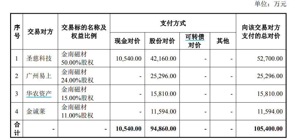 【大河财立方消息】10月10日晚间,广州新莱福新材料股份有限公司(证券简称:新莱福)发布公告称,公司拟向圣慈科技、广州易上、华农资产、金诚莱发行股份及支付现金购买其持有金南磁材100%股权。本次交易价格10.54亿元,预计构成重大资产重组。交易完成后,金南磁材将成为新莱福子公司。