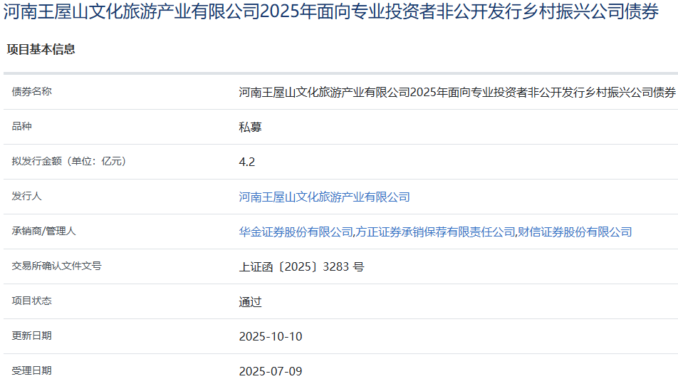 【大河财立方消息】10月11日,河南王屋山文化旅游产业有限公司2025年面向专业投资者非公开发行乡村振兴公司债券项目获上交所通过。