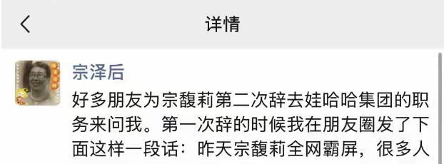 10月11日,宗馥莉的三叔宗泽后在朋友圈发文称,好多朋友为宗馥莉第二次辞去娃哈哈集团的职务问他。第一次辞的时候他在朋友圈发了一段话,其中提到,宗馥莉最大的问题是接班娃哈哈不应该考虑如何做大规模、如何赚钱,如何大刀阔斧改变现状,首要考虑是如何做好事,让所有人都认可,但她却反其道而行之。
