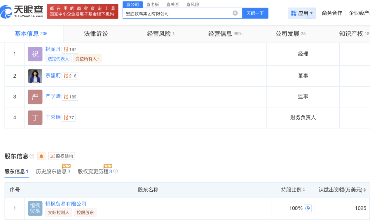 10月11日,记者注意到,名为“娃小宗”的微博账号已于9月30日注册,账号认证信息为宏胜饮料集团有限公司。天眼查信息显示,宗馥莉为该公司董事,公司控股股东为恒枫贸易有限公司。今年5月,宏胜集团申请注册“娃小宗”系列商标。