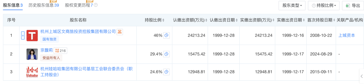 从股权架构看,目前宗馥莉依旧是娃哈哈集团三方股东之一,持股29.4%,杭州上城区文商旅投资控股集团有限公司持股46%,杭州娃哈哈集团有限公司基层工会联合委员会(职工持股会)持股24.6%。