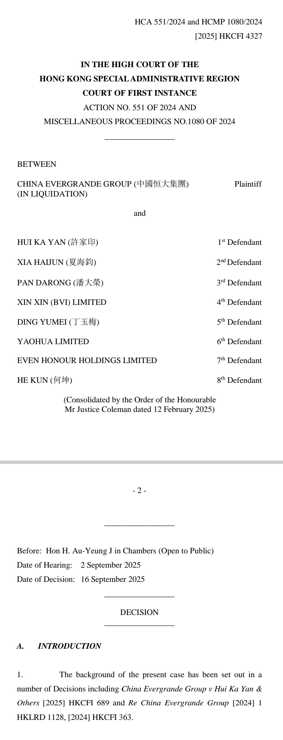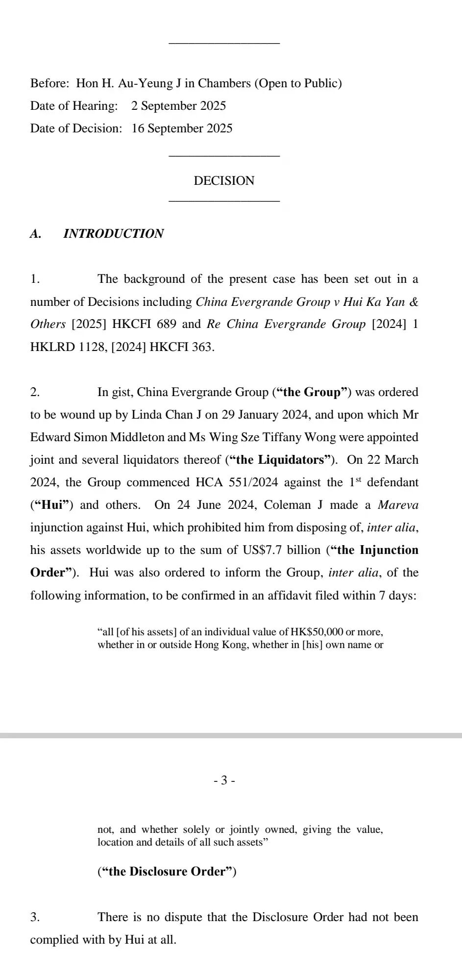 对此,记者获取的香港高等法院判决书显示,该案的背景是2024年6月,科尔曼法官对许家印下达马雷瓦禁令(Mareva injunction),禁止其处置包括全球资产在内的总额达77亿美元的财产,同时许家印还被要求向恒大集团通报其个人所有价值5万港元以上的资产信息,并须在7日内通过宣誓书确认。