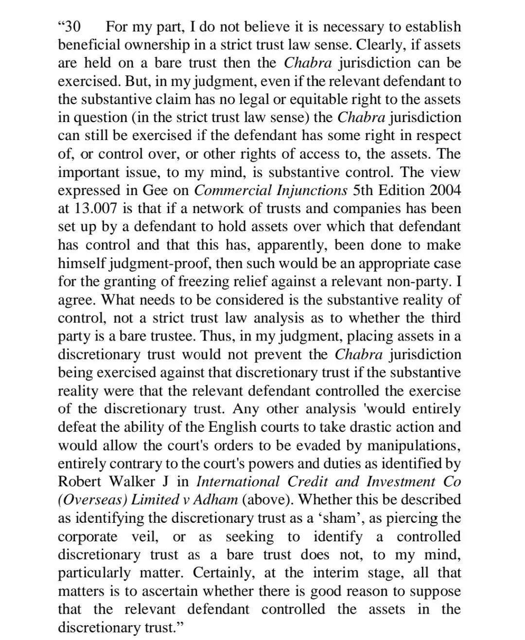 在判决书中,香港高等法院法官也提到:“若资产仅以消极信托形式持有,则可行使查布拉管辖权(the Chabra jurisdiction,一种资产冻结令 )。但依我之见,即便涉事被告在严格信托法意义上对相关资产不享有法定或衡平法上的权利,只要其对该资产具有某种控制权、支配权或其他接触权,仍可行使查布拉管辖权,关键在于实际控制权的实质存在。”