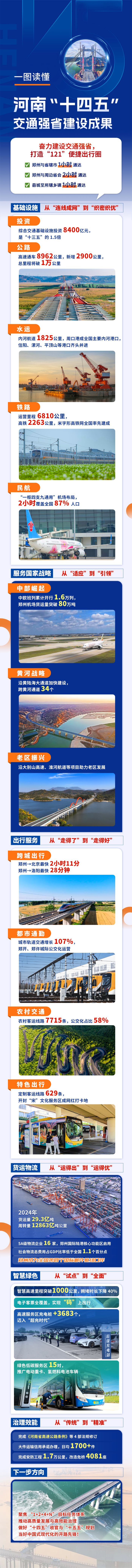 ——公路加密提质,绘就中原大地新坦途。已通车高速公路8962公里,“十四五”新增里程超2900公里,是“十三五”时期的3.6倍,总里程将突破1万公里,90%以上的县将迈入“双高速”时代。新改建普通干线公路4500公里,实现所有高铁站、机场、港口、省级开发区二级及以上公路连通,省际通道达152条,开启出省“快车道”。打造四大“一号旅游公路”超1万公里,林州林石路、兰考兰赵线、鲁山环湖路获评全国“十大最美农村路”。