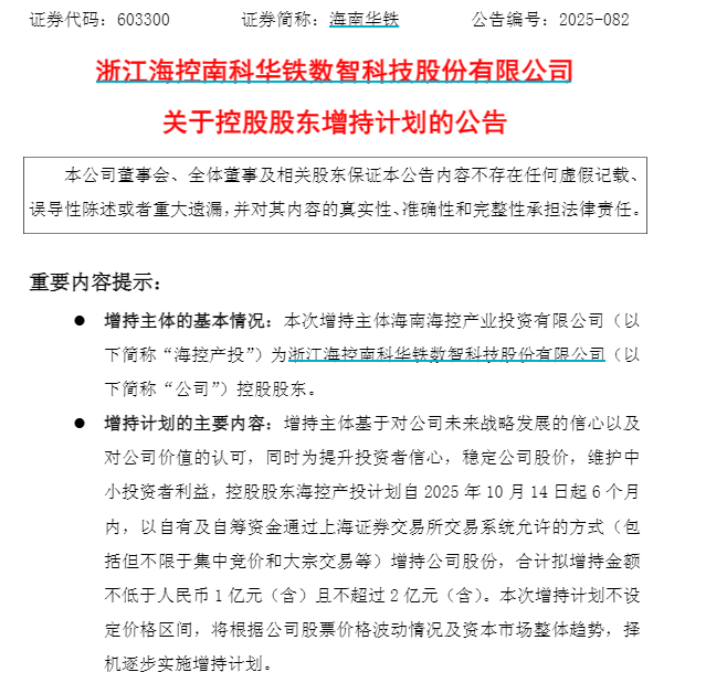 据海南华铁公告,控股股东海南海控产业投资有限公司(简称海控产投)计划自 2025年10月14日起6个月内,以自有及自筹资金通过上海证券交易所交易系统允许的方式(包括但不限于集中竞价和大宗交易等)增持公司股份,合计拟增持金额不低于人民币1亿元(含)且不超过2亿元(含)。