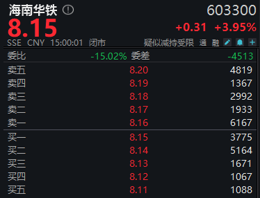 【大河财立方消息】10月13日午间,浙江海控南科华铁数智科技股份有限公司(证券简称海南华铁)披露控股股东增持计划。午后开盘,该股跌幅快速收窄,随即止跌,并一度冲高至8.48元,涨幅超8%。截至收盘,海南华铁股价报8.15元,上涨3.95%。
