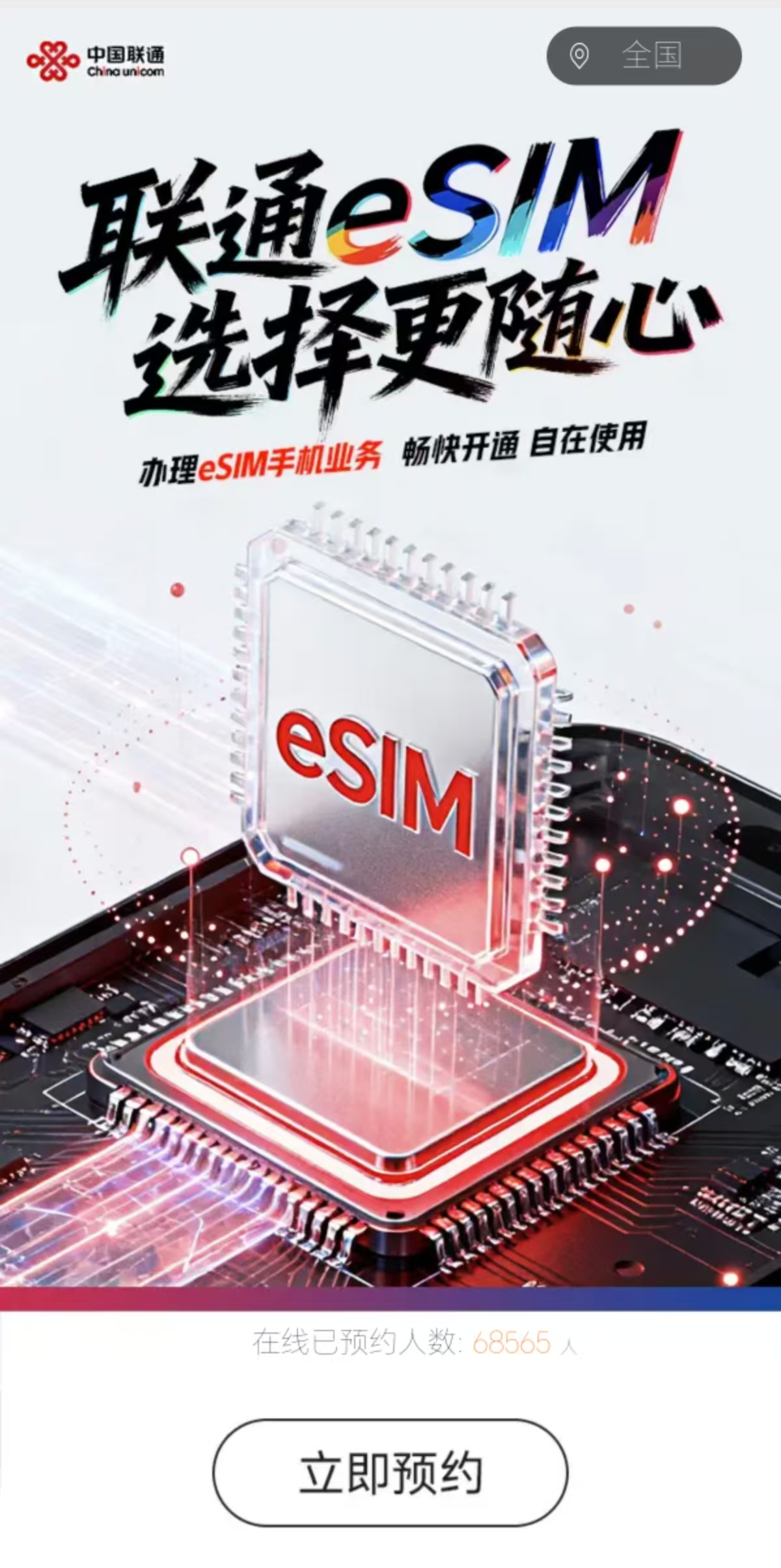 同日,中国联通也宣布,近期已正式获得开展eSIM手机运营服务商用试验的批复,同时开放eSIM预约通道。截至发稿,中国联通线上预约人数已近7万人。