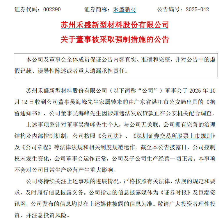 【大河财立方消息】10月13日,苏州禾盛新型材料股份有限公司(证券简称:禾盛新材)公告,收到公司董事吴海峰家属转来的由广东省湛江市公安局出具的《拘留通知书》,吴海峰因涉嫌违法发放贷款,正在公安机关配合调查。