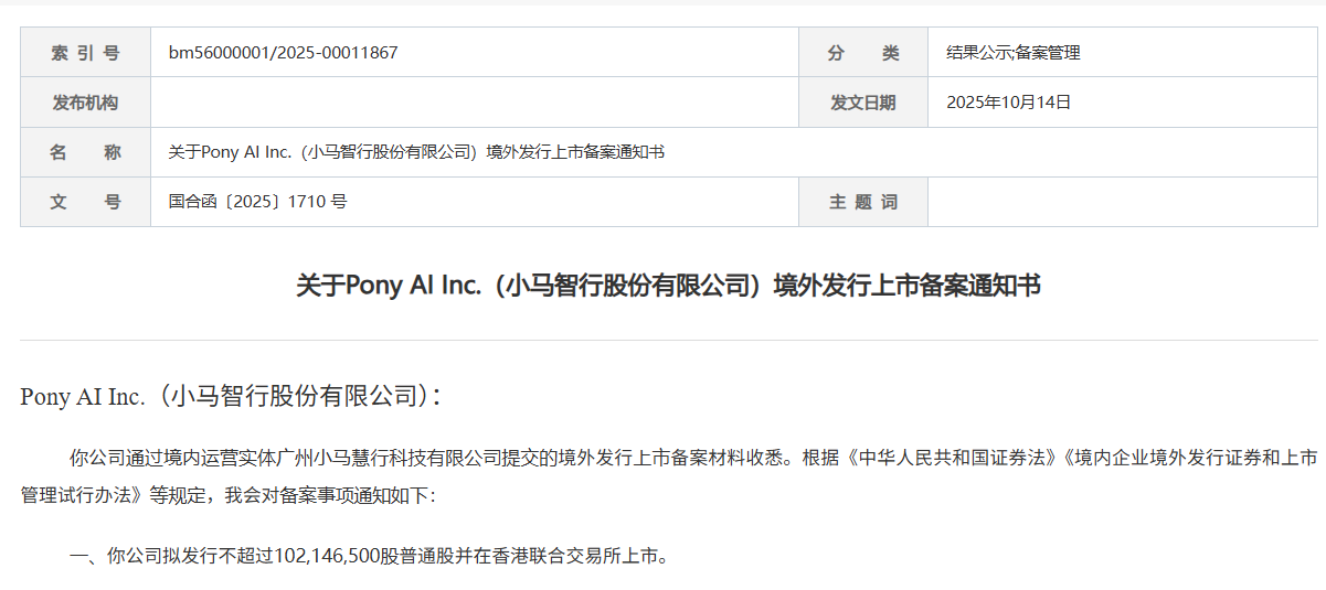 小马智行通过境内运营实体广州小马慧行科技有限公司,向证监会提交境外发行上市备案材料。该拟发行不超过1.02亿股普通股并在香港联合交易所上市。