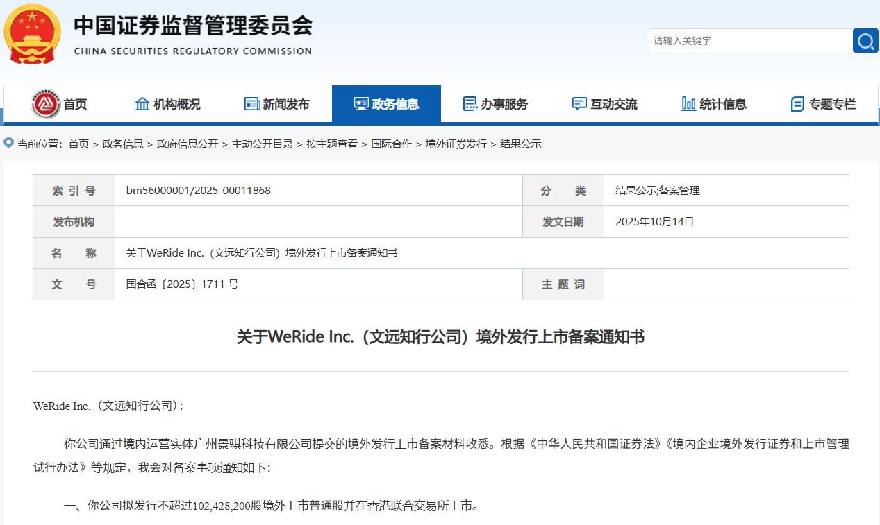 文远知行通过境内运营实体广州景骐科技有限公司,向证监会提交境外发行上市备案材料。该公司拟发行不超过1.02亿股境外上市普通股并在香港联合交易所上市。