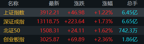 截至当日收盘,上证指数涨1.22%,报3912.21点,深证成指涨1.73%,报13118.75点,创业板指涨2.36%,报3025.87点。沪深京三市上涨个股超4300只。