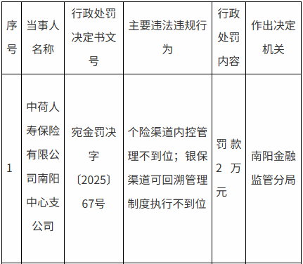 【大河财立方消息】10月15日,国家金融监督管理总局南阳金融监管分局披露的行政处罚信息显示,因个险渠道内控管理不到位、银保渠道可回溯管理制度执行不到位,中荷人寿保险有限公司南阳中心支公司被罚2万元。