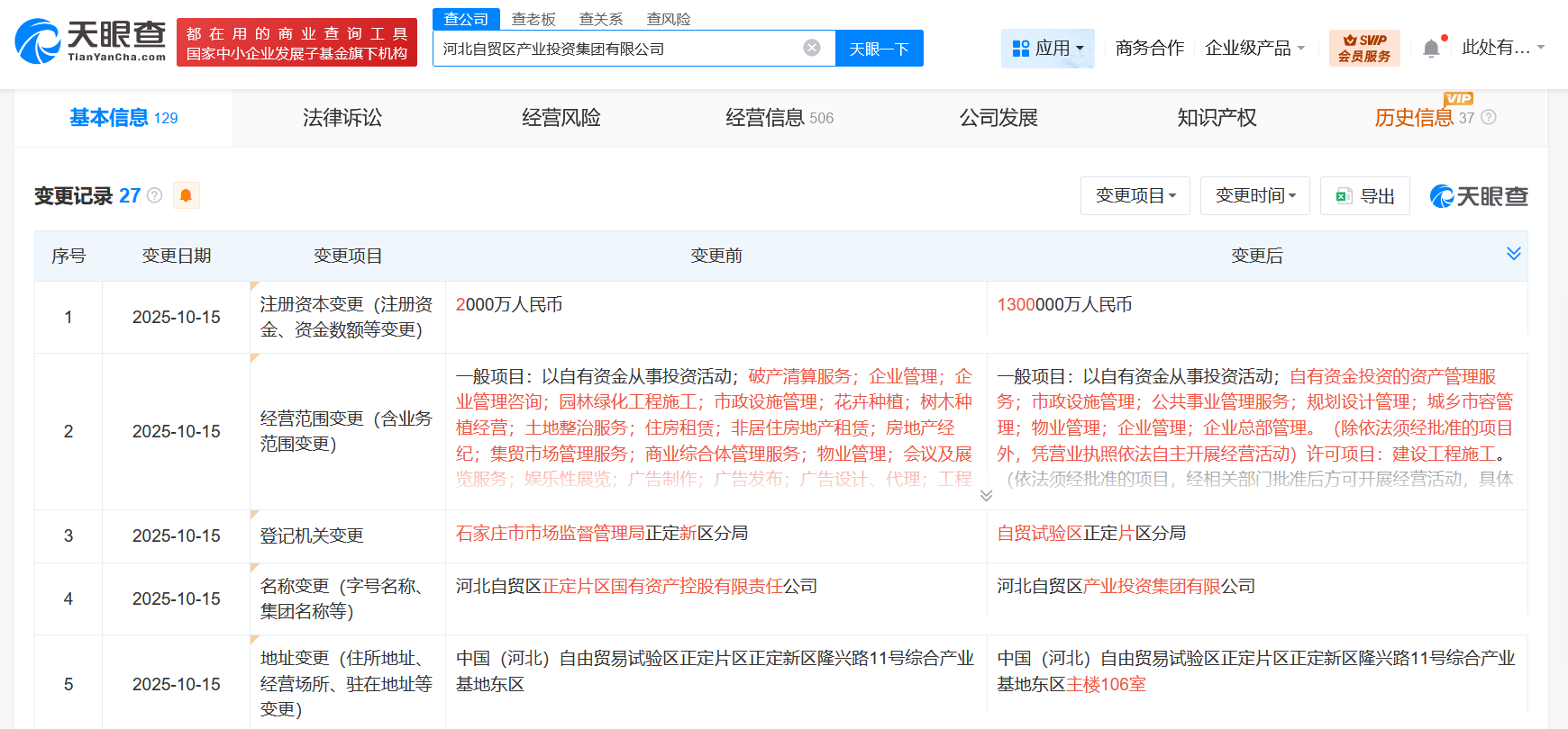 【大河财立方消息】天眼查App显示,10月15日,河北自贸区正定片区国有资产控股有限责任公司发生工商变更,企业名称变更为河北自贸区产业投资集团有限公司,同时,注册资本由2000万人民币增至130亿人民币,增幅64900%。