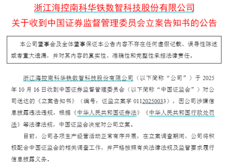 【大河财立方消息】10月16日晚间,浙江海控南科华铁数智科技股份有限公司(证券简称海南华铁)发布公告称,收到中国证监会对公司送达的《立案告知书》,因公司涉嫌信息披露违法违规,根据有关法律法规,中国证监会决定对公司立案。
