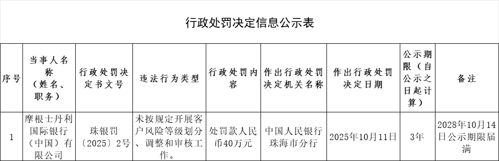 【大河财立方消息】10月17日消息,中国人民银行珠海市分行近日披露行政处罚信息,因未按规定开展客户风险等级划分、调整和审核工作,摩根士丹利国际银行(中国)有限公司被罚40万元。